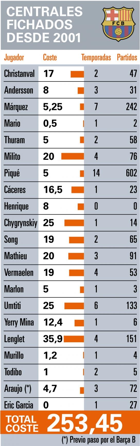自从2001-02赛季以来,巴萨一共花费2.53亿欧元签下了21名中卫,加上19名梯队升入一队的中卫,一共是40人。